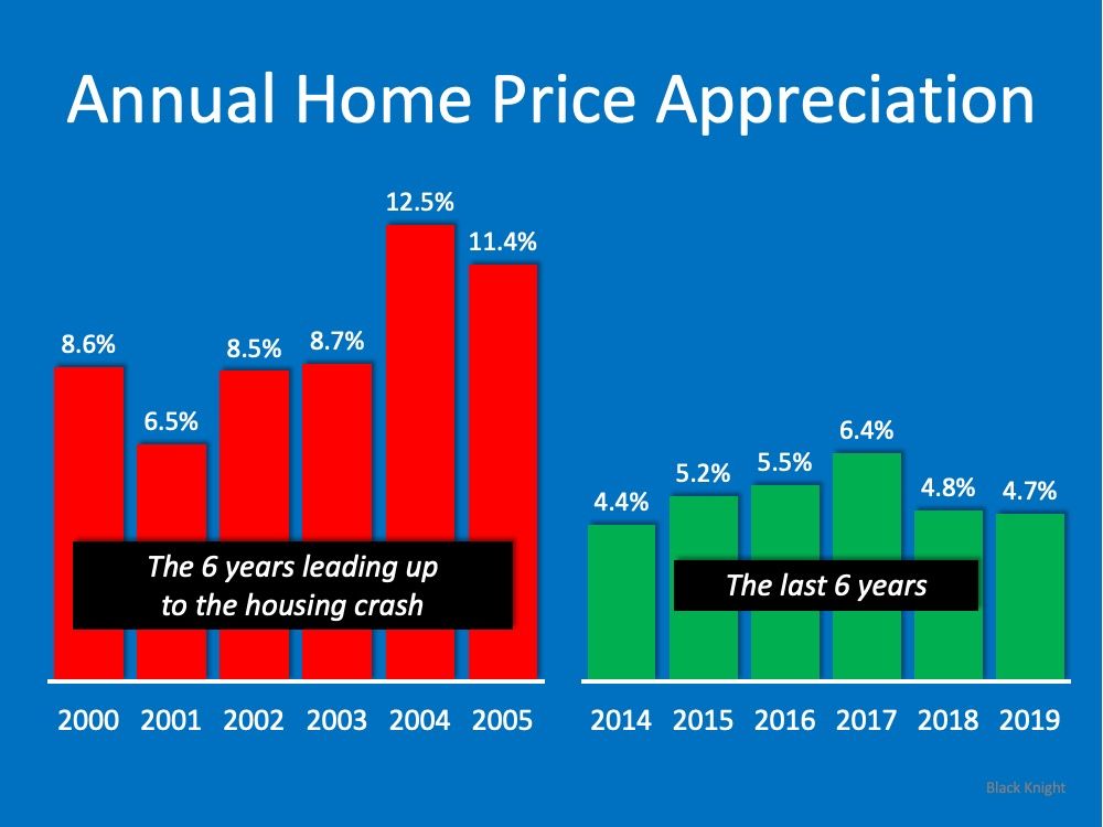 When we look at appreciation in the visual below, there’s a big difference between the 6 years prior to the housing crash and the most recent 6-year period of time. Leading up to the crash, we had much higher appreciation in this country than we see today. In fact, the highest level of appreciation most recently is below the lowest level we saw leading up to the crash. Prices have been rising lately, but not at the rate they were climbing back when we had runaway appreciation.