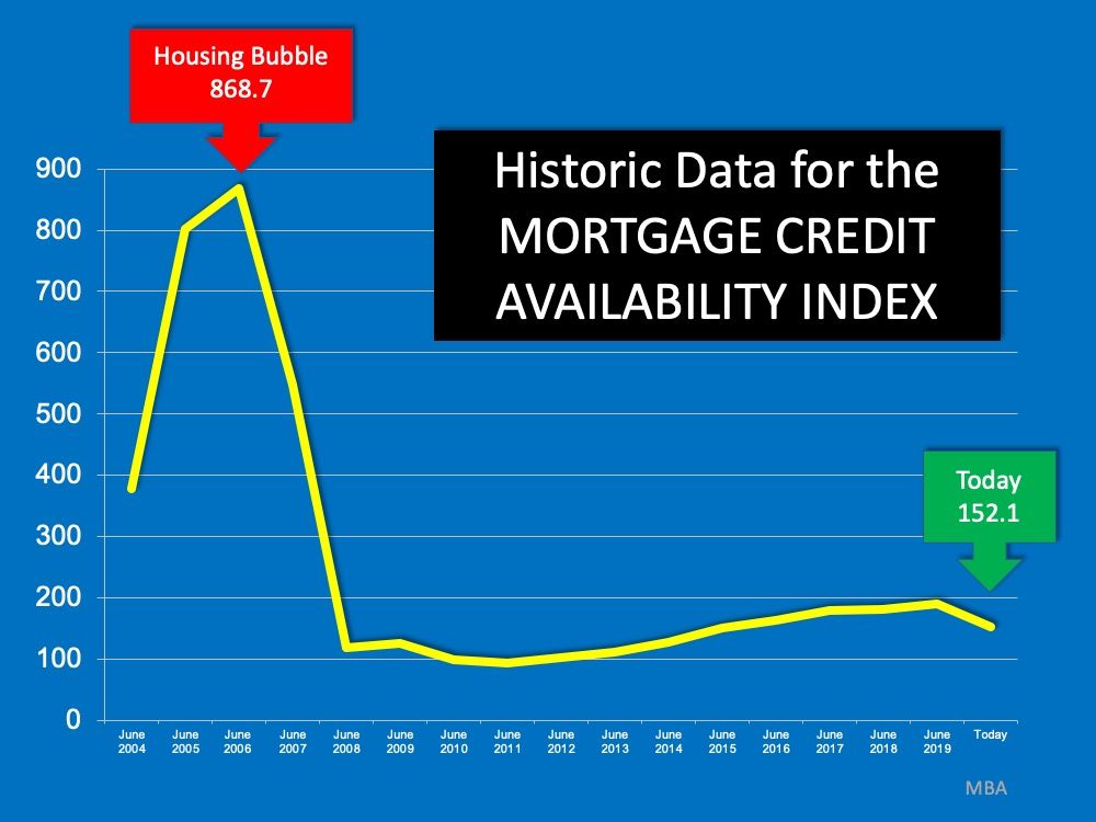 The Mortgage Credit Availability Index is a monthly measure by the Mortgage Bankers Association that gauges the level of difficulty to secure a loan. The higher the index, the easier it is to get a loan; the lower the index, the harder. Today we’re nowhere near the levels seen before the housing crash when it was very easy to get approved for a mortgage. After the crash, however, lending standards tightened and have remained that way leading up to today.