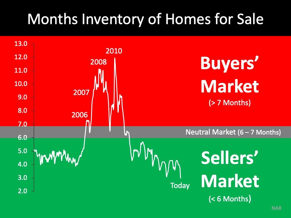 One of the causes of the housing crash in 2008 was an oversupply of homes for sale. Today, as shown in the next image, we see a much different picture. We don’t have enough homes on the market for the number of people who want to buy them. Across the country, we have less than 6 months of inventory, an undersupply of homes available for interested buyers.